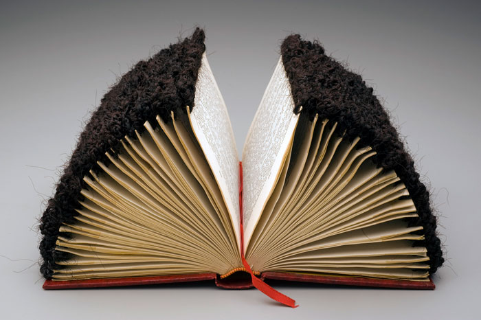 This isn’t metaphorical resistance. Banks’s work intervenes in ongoing struggles over whose knowledge counts, whose literacy matters, and whose stories deserve preservation. Her “Edges“ series — altered Spanish-language books featuring hair attached in patterns based on braided hairstyles of African ancestry — was created in direct response to anti-immigration rhetoric. The series acknowledges “not only the creativity, activity, and life that occur on and outside the margins of mainstream culture, but also the effect marginalized communities have on mainstream culture.”