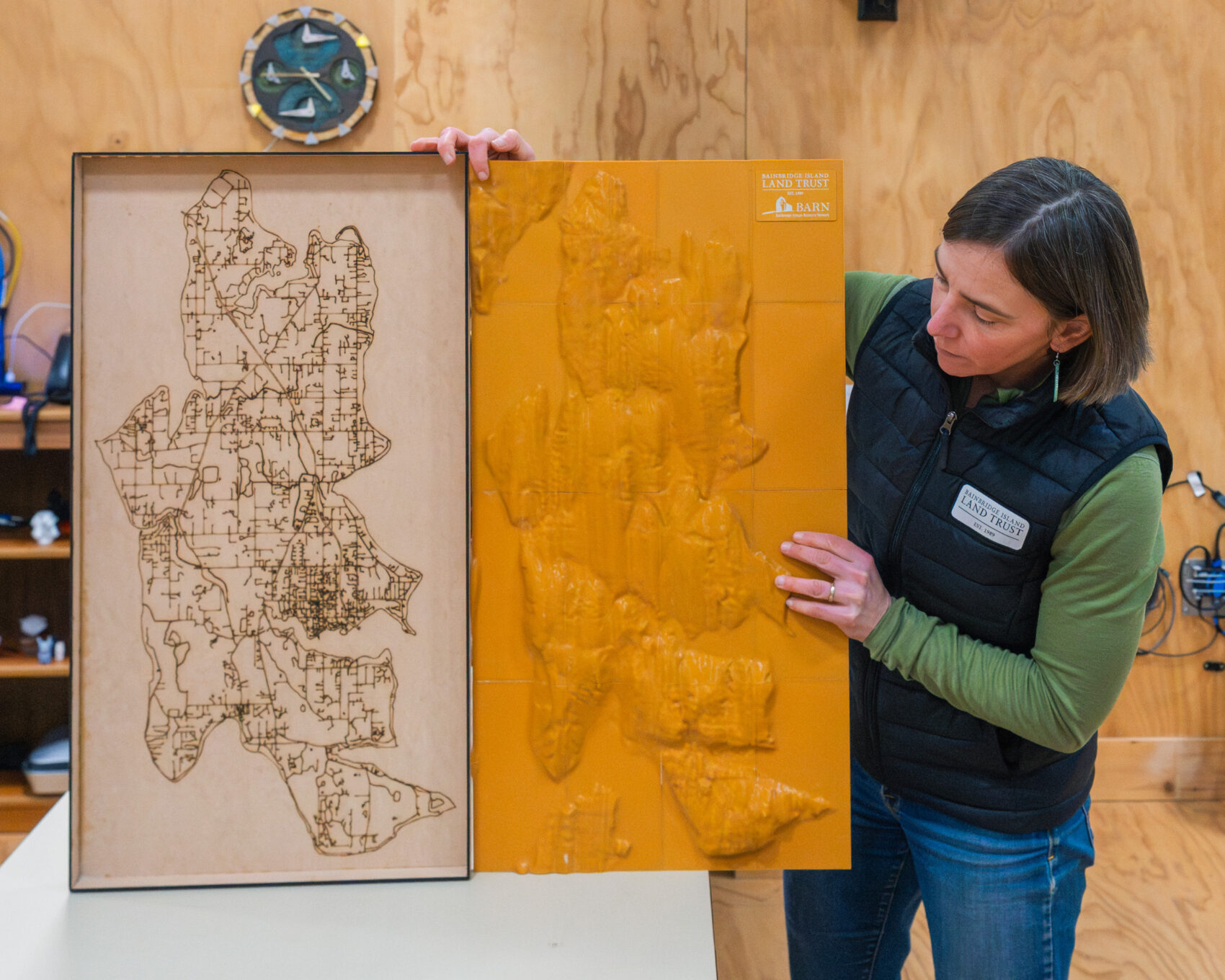 Had you visited BARN in the dead of night over a couple of months in late 2025, you might have heard the hum of 3D printers coming from the Tech Lab. After about 40 hours of that overnight work, which Studio Lead Keith La Plain set up after Open Studios, 16 tiles representing the topography of Bainbridge Island were created. They were assembled into what is now a powerful educational tool for the Bainbridge Island Land Trust (BILT) — without the healthy budget, grant proposals, and time delay initially anticipated.