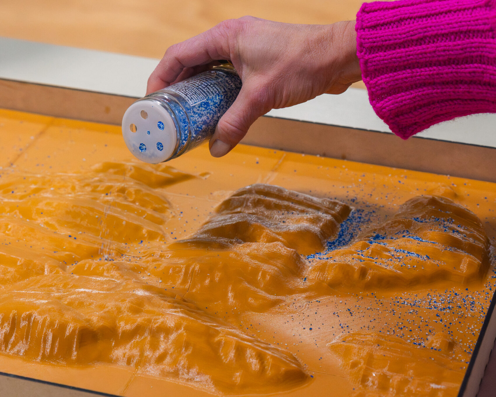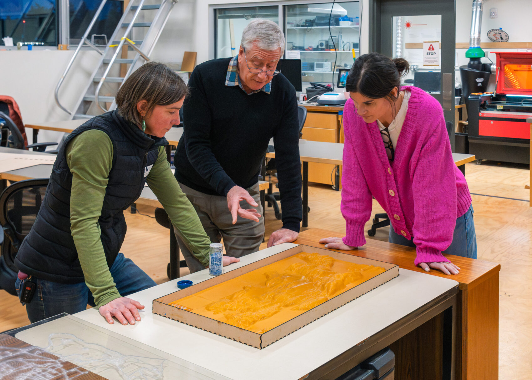 “People will want to put their fingers on it (‘I live here!’ ‘This is our school.’) … big enough for a group of students (or adults!) to cluster around, locate a place that’s important to them, and then pour sand or water on top to see where the water goes, or how the ‘water’ builds up when something gets in the way,” she wrote.