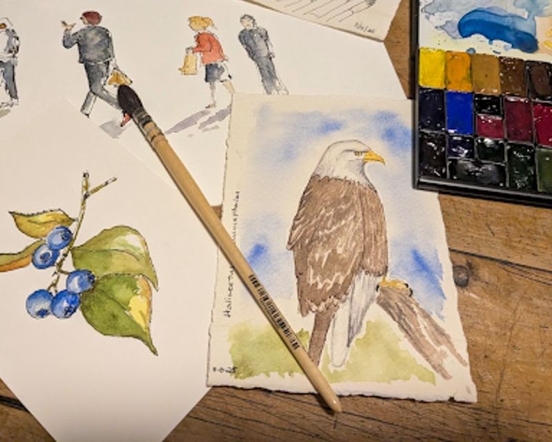 The meetup host is Drawing & Painting Studio Lead Carla Mackey. She says she’s not an expert watercolorist but rather an enthusiastic learner and experimenter. Her primary goal for the weekly watercolor meetup is to create a community of people who love watercolor; want to learn and practice in a safe, non-competitive space; and maybe relax and laugh along the way.